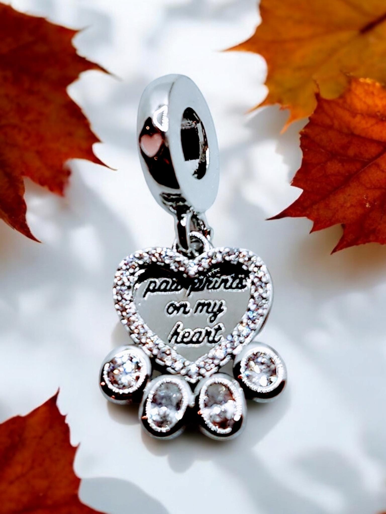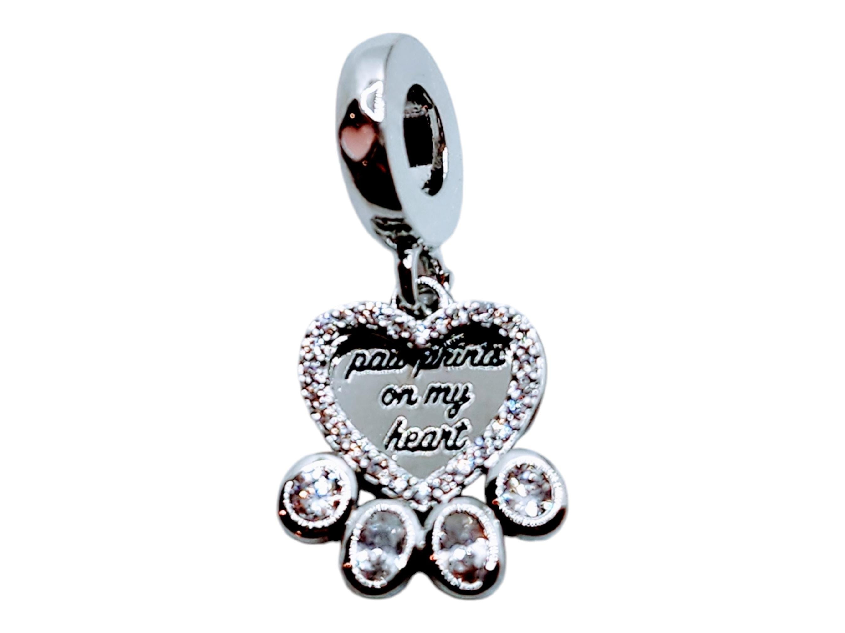 At the center of the paw print lies a heart-shaped charm, engraved with "Paw Prints on My Heart", symbolizing the deep bond and unconditional love shared between pets and their owners.