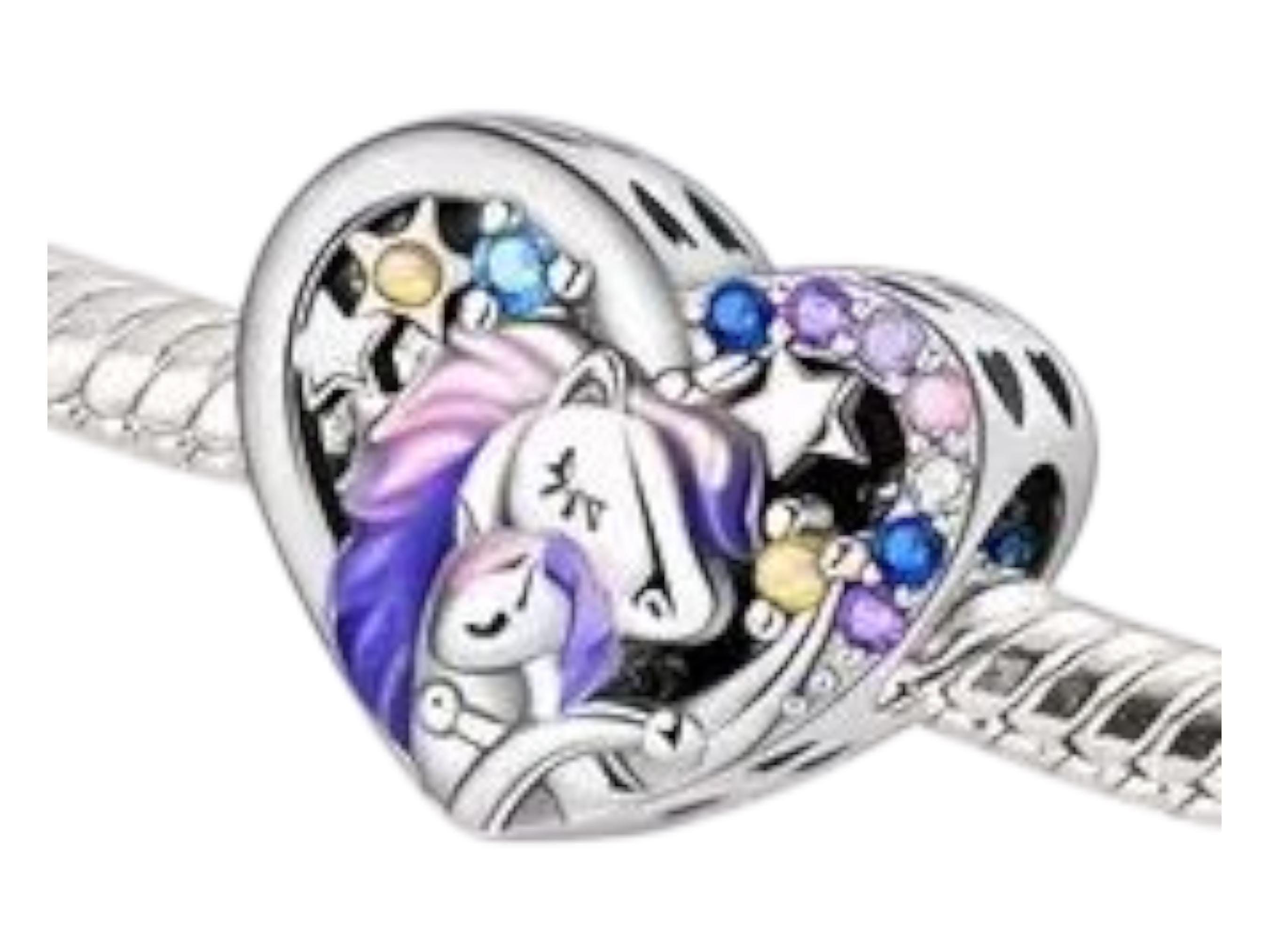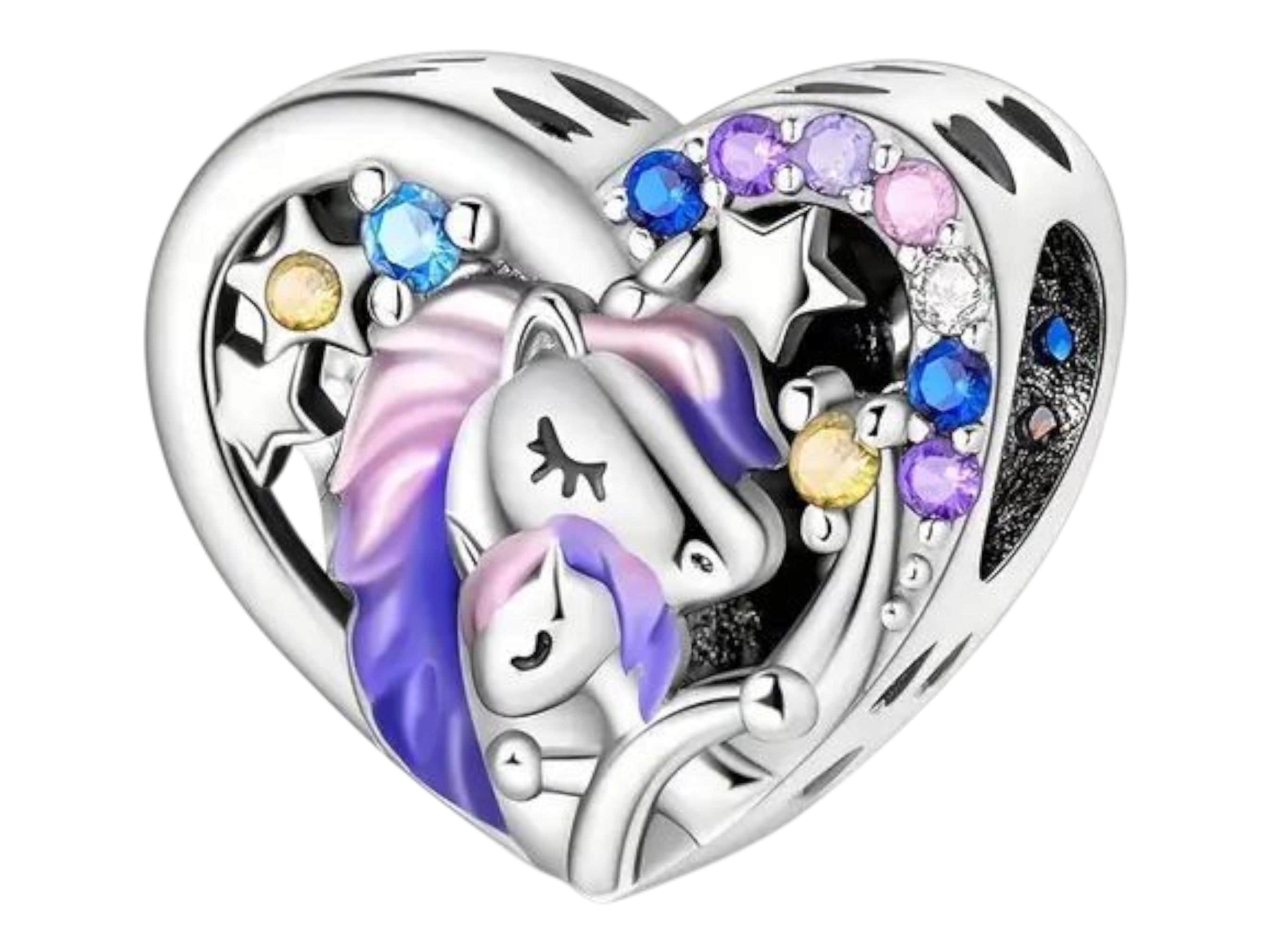 Celebrate love, dreams, and a touch of magic with this enchanting unicorn charm. Crafted in a delicate heart shape, it features a sweet mother-and-baby unicorn design accented with sparkling stars and a rainbow of shimmering crystals in shades of blue, purple, pink, and golden yellow.