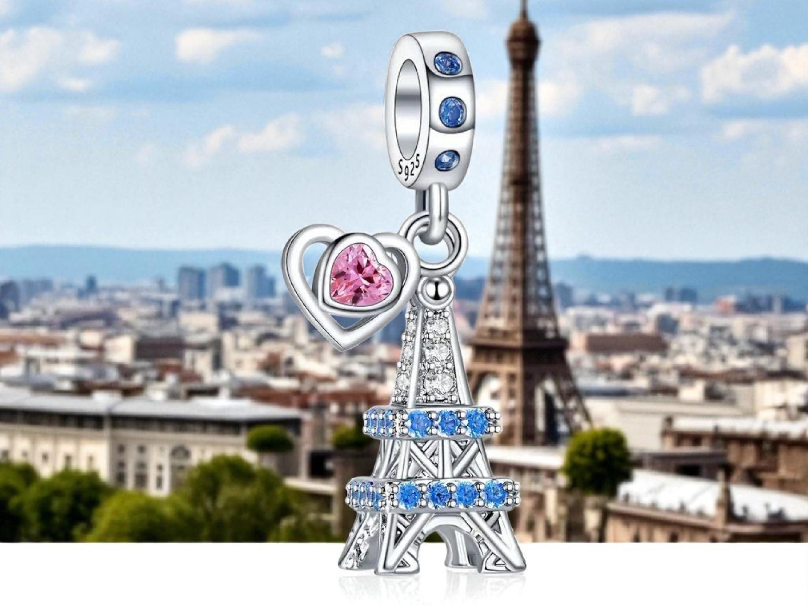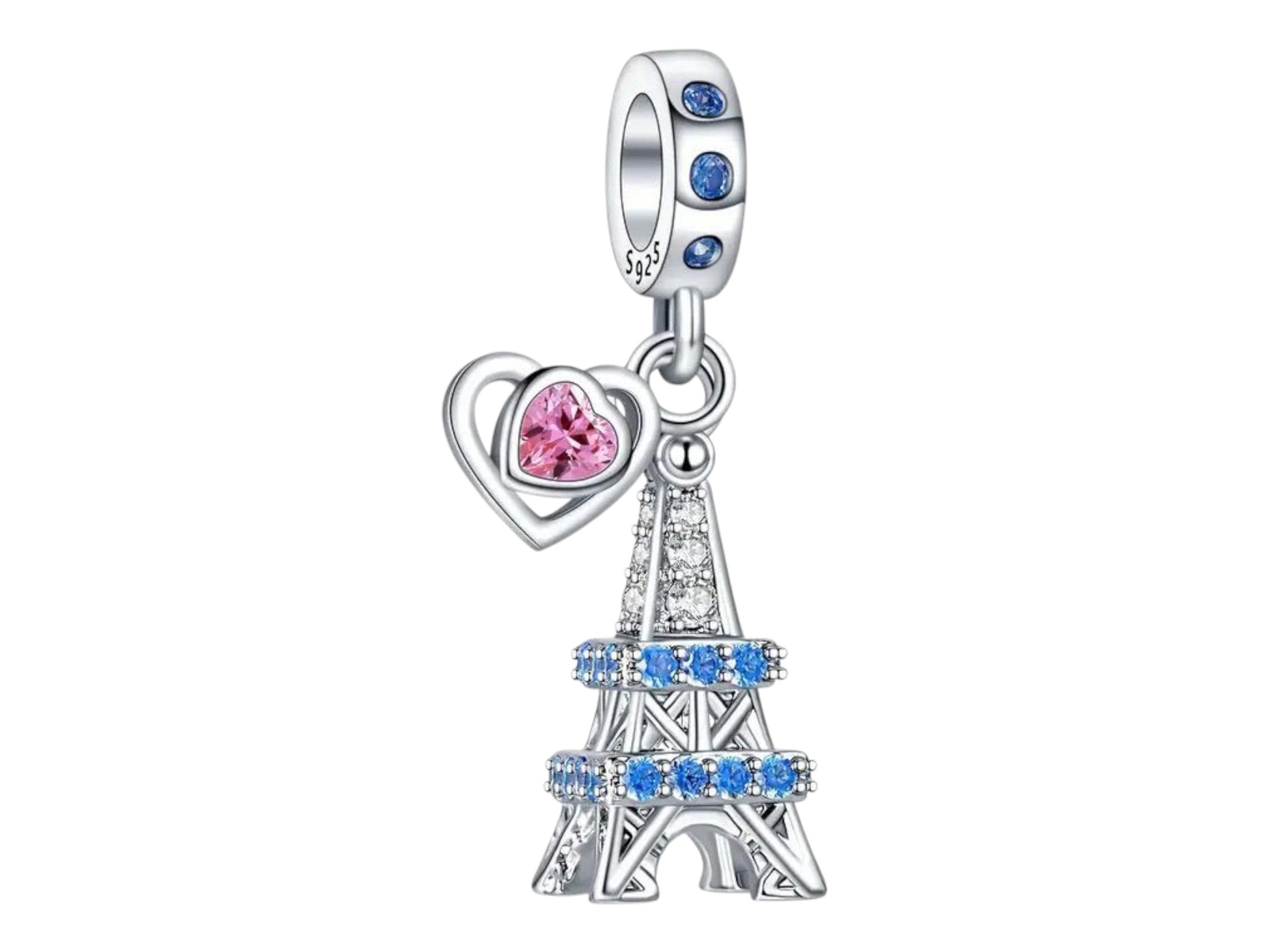 Sterling Silver Eiffel Tower Charm: Cubic Zirconia, Pink Heart - Fits Pandora