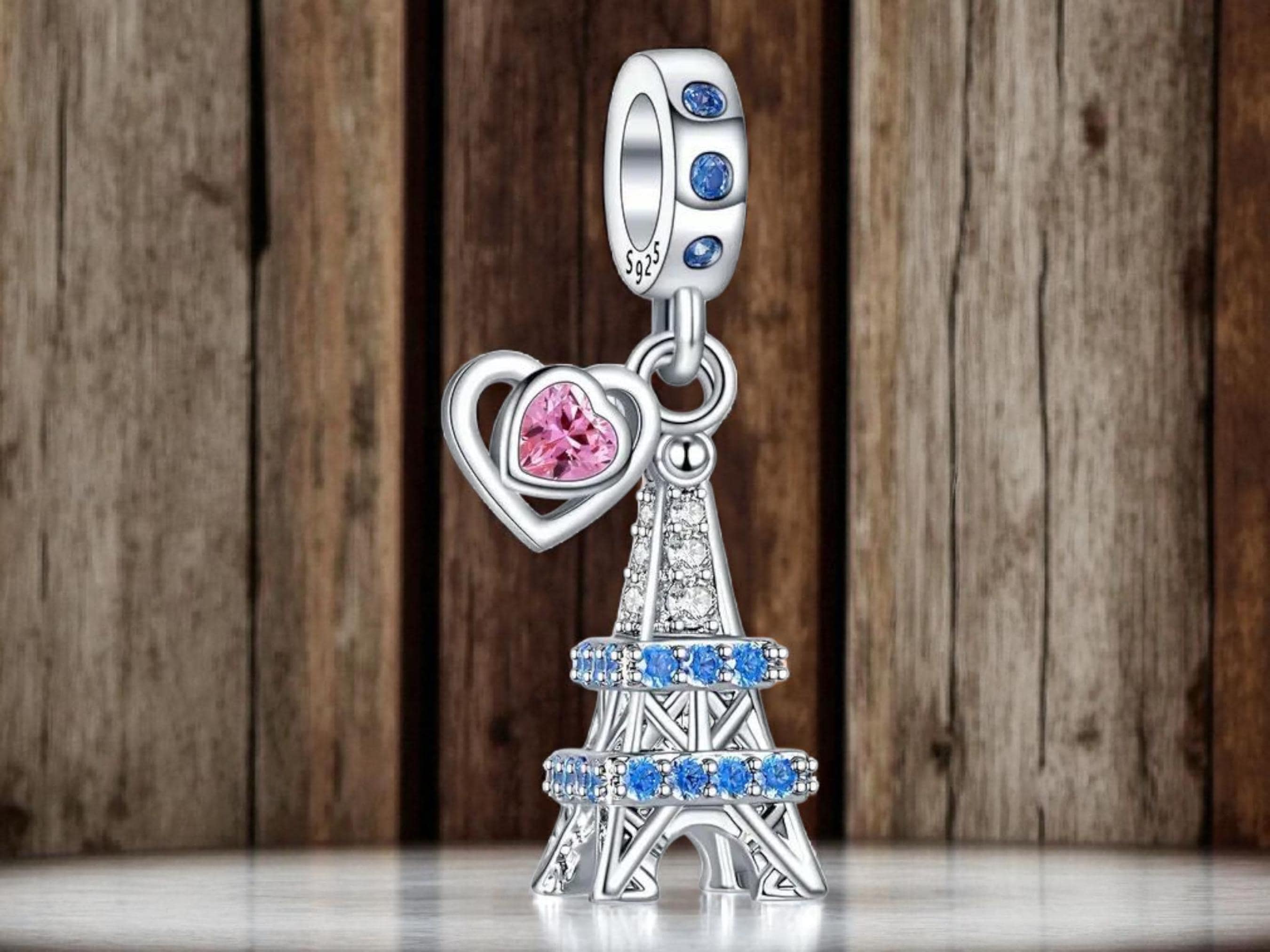 Bring a touch of Parisian romance to your jewelry collection with this Eiffel Tower charm with heart. Crafted in high-quality sterling silver, the iconic tower is adorned with sparkling blue and clear cubic zirconia, capturing the magic of the City of Lights. A dangling heart with a vibrant pink stone adds the perfect symbol of love and elegance.