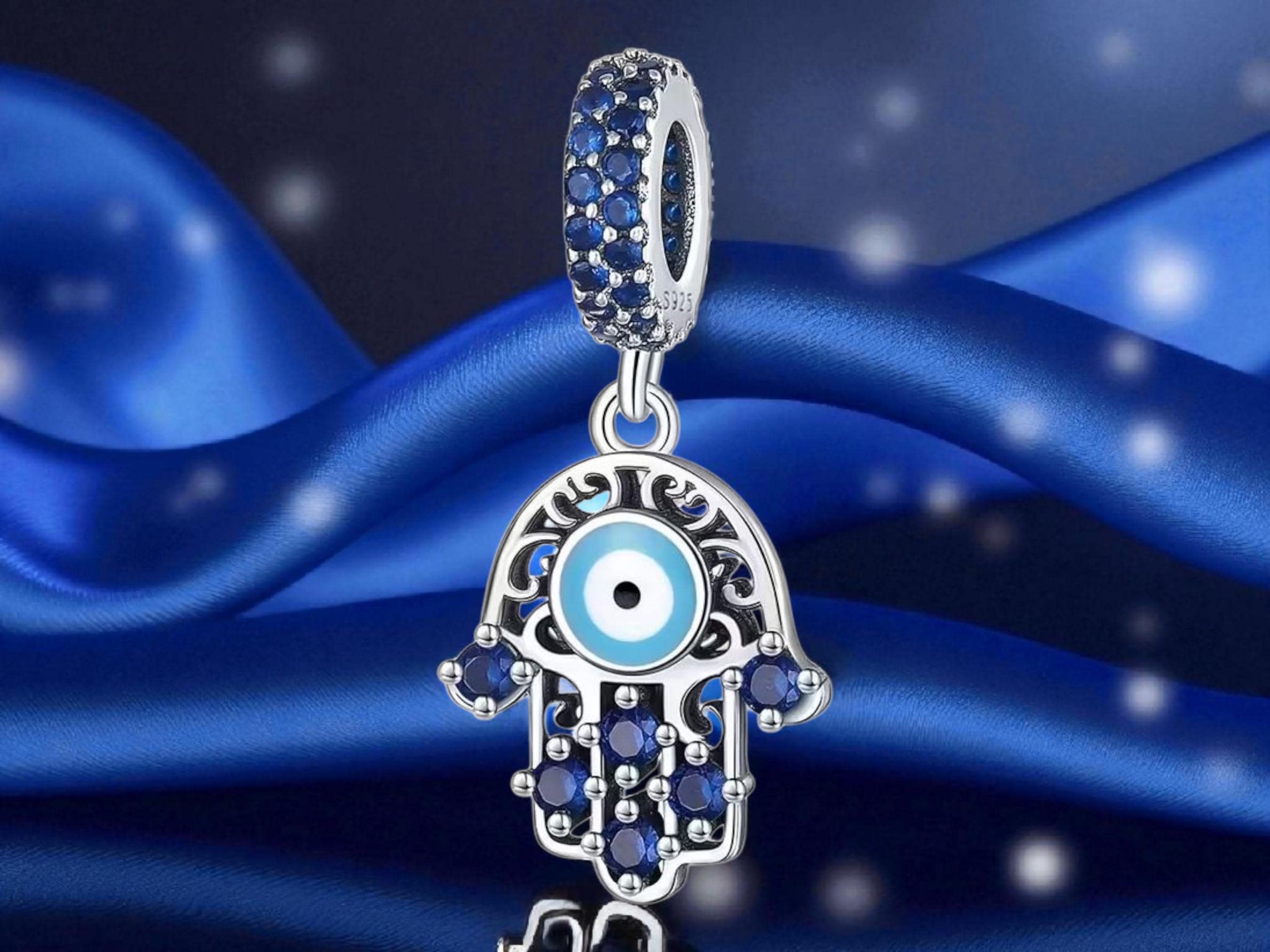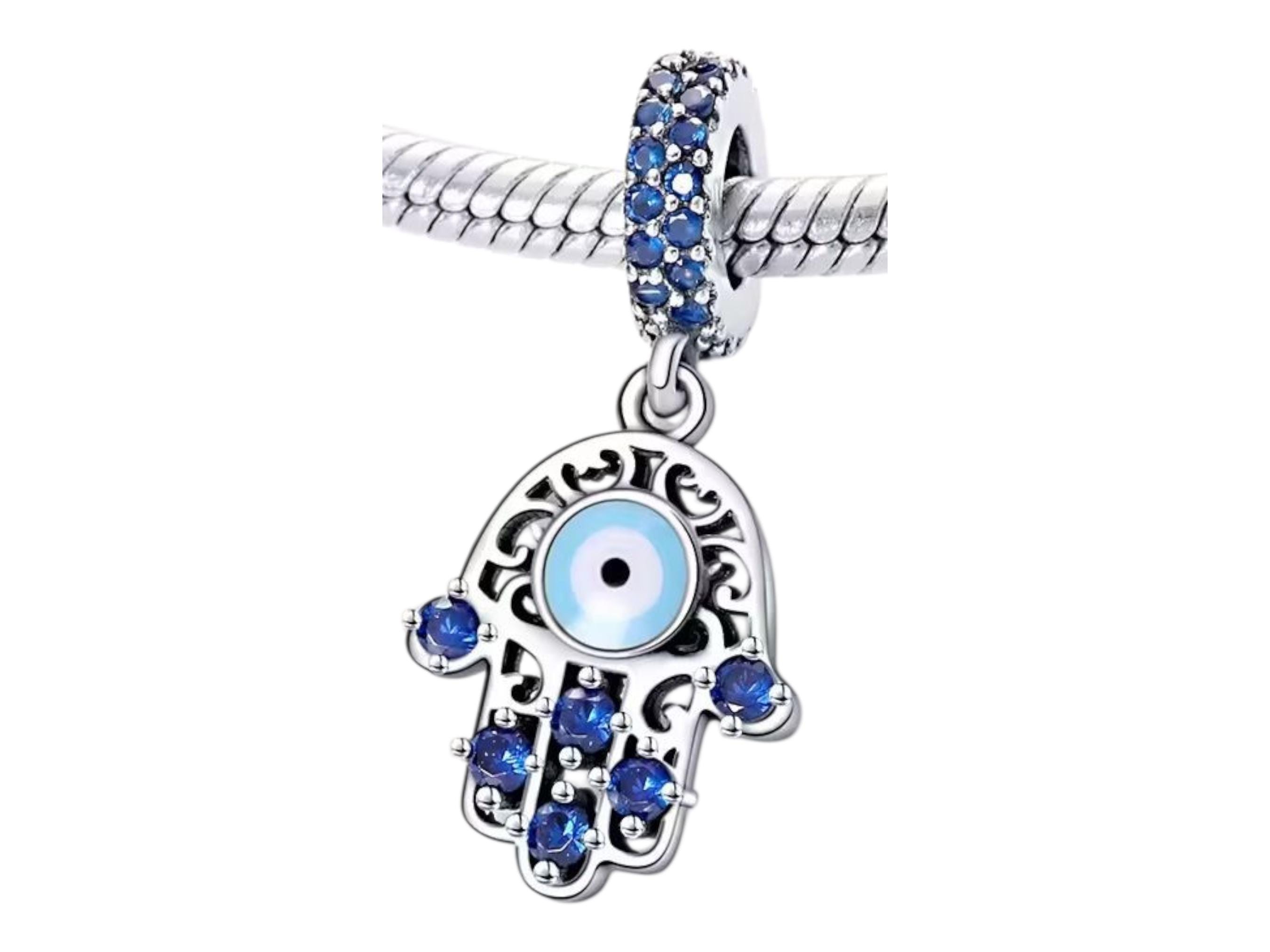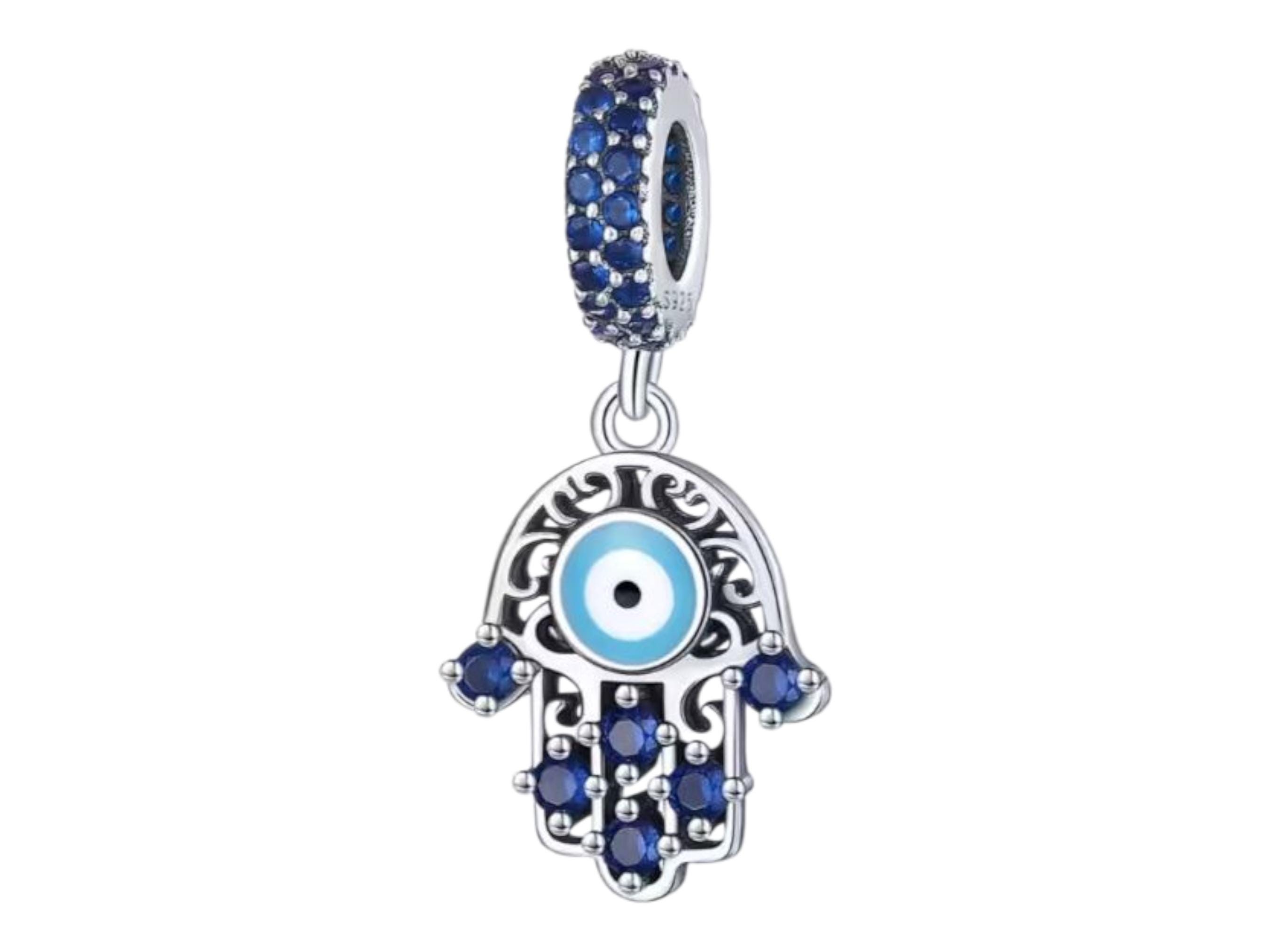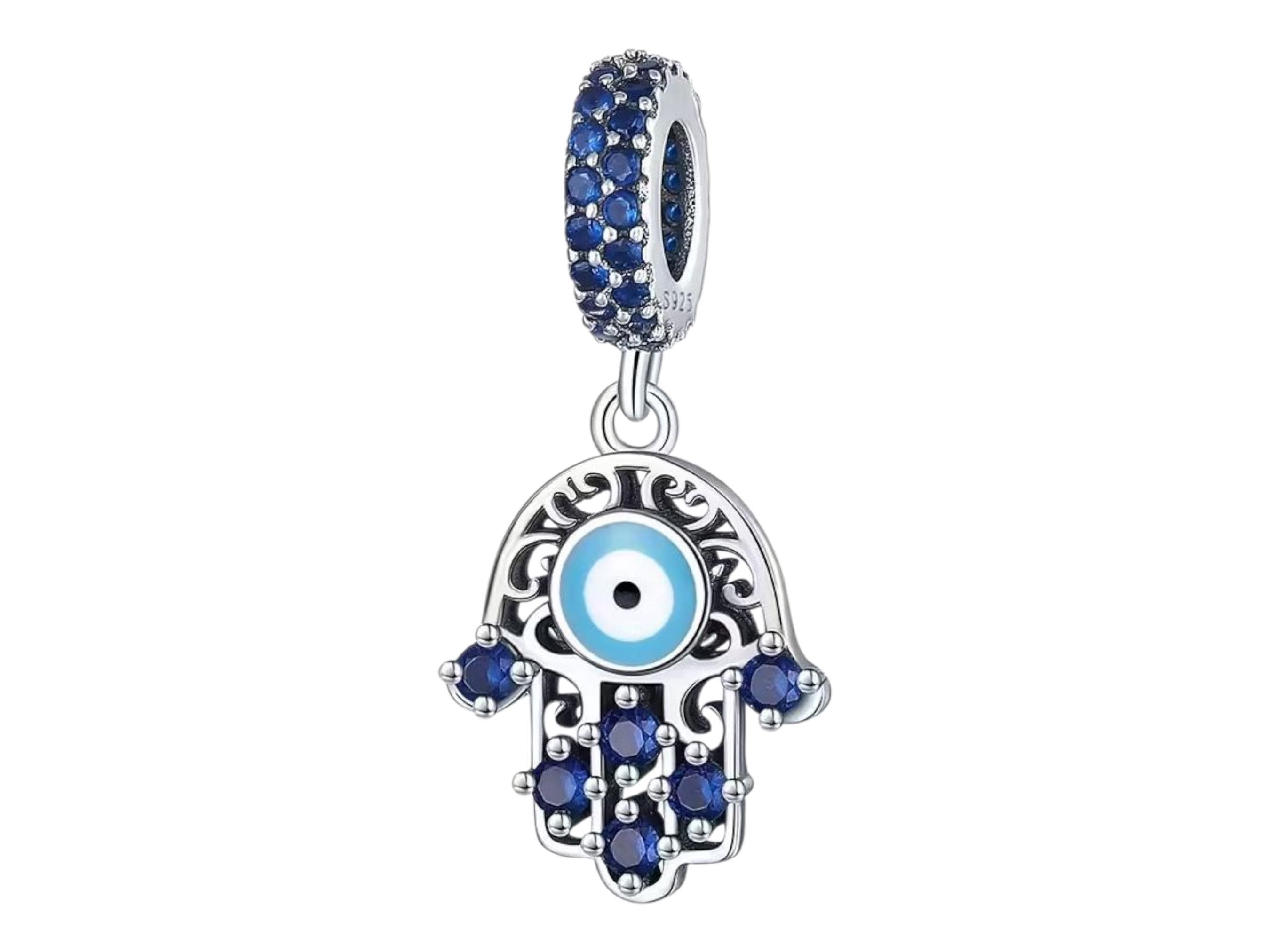 Ward off negativity in style with this stunning Blue Evil Eye Hamsa Hand Charm. Crafted from 925 sterling silver, this intricate charm features a detailed filigree Hamsa hand design adorned with deep sapphire blue crystals and a protective evil eye center.